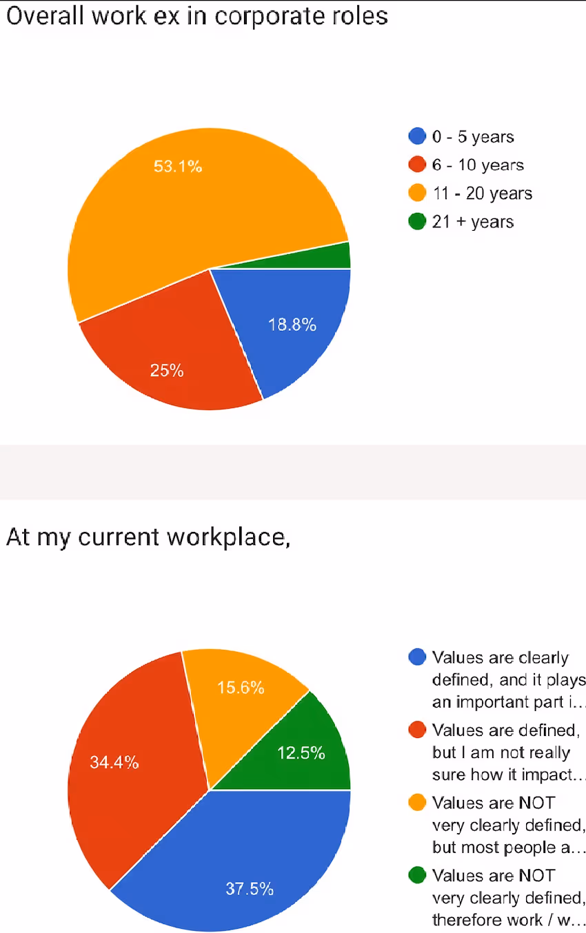 Digging deeper, 50% of the 0-5 years work experience cohort responded that they were unsure of how values impacted their daily work, even though their organisations had well defined values. One would think this is expected, given that this group may have not yet experienced deep challenges or conflicts at the workplace, where values come in handy.