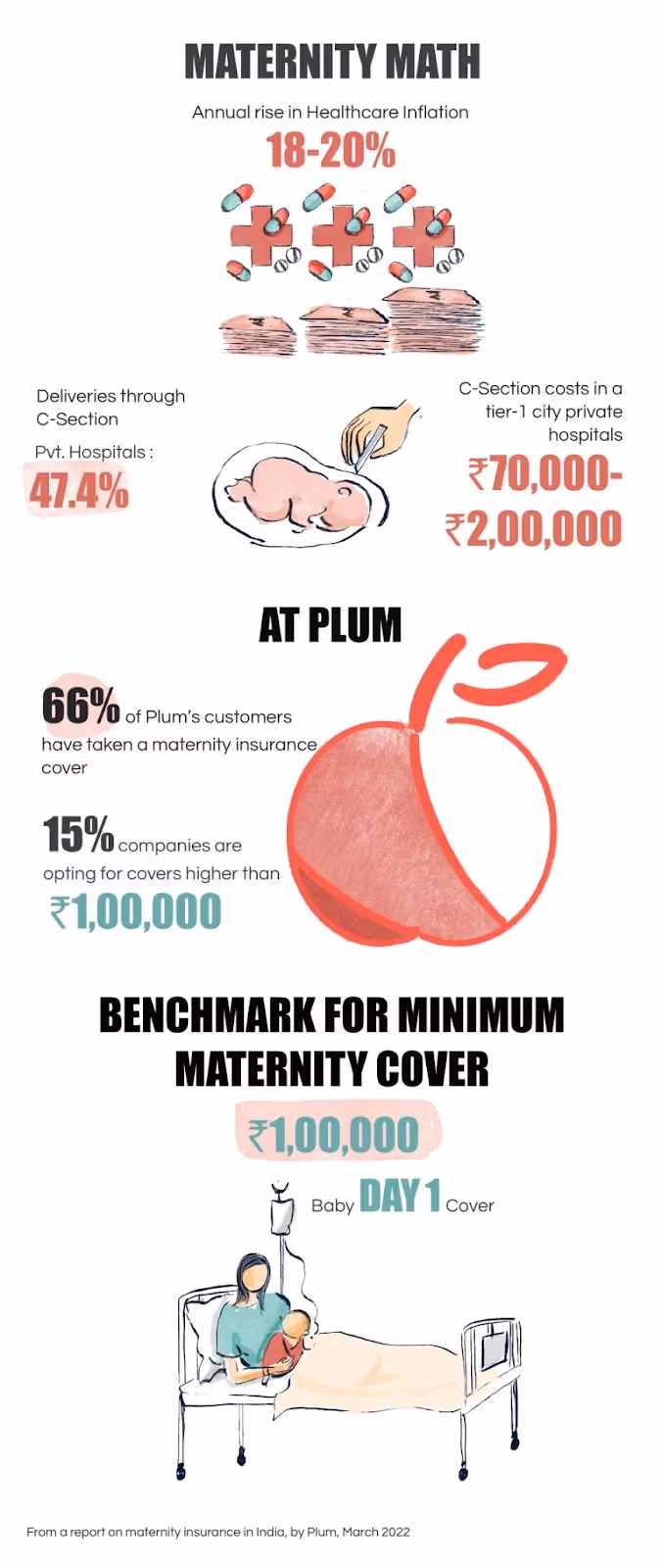 According to the WHO, C-sections have risen world-wide from 7% in the ‘90s to 21% of all child births in 2021. They estimate that by 2030, that rate would breach nearly half of all deliveries in many countries in the world. And when you consider the cost of C-section births being higher, a much clearer picture begins to emerge. Companies today are in a position to do better, much better. Within Plum’s own database, we see 15% companies (of those that have maternity benefits) taking up covers that range from INR 1,00,000 upwards for maternity. 100% of these companies opt for a Baby Day One cover (covering the baby from the day it is born).