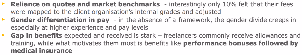 Organisations are now thinking of freelance/ contract talent strategically. It is no longer a matter of choice and forward-thinking organisations already have policies for hiring and retaining contractual staff. However, as per a study on ‘understanding perspectives of skilled freelancers’ by FlexingIt, while more companies are hiring freelancers, there is a major gap in the compensation framework for freelancers; and their fees are mostly set in an unstructured manner with stark gaps in benefits received and expected, and lack of gender parity.